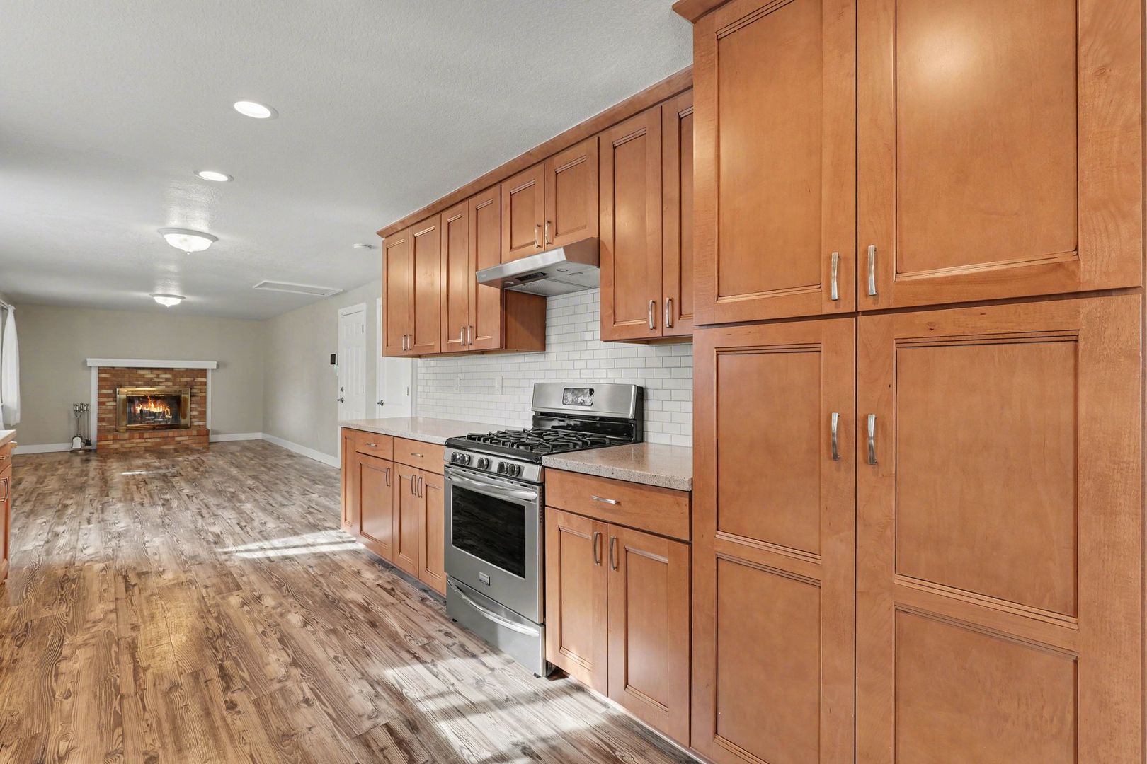 The home features a bright and open living area with a cozy wood-burning fireplace, along with dedicated living and dining spaces that provide plenty of room for entertaining or everyday comfort. The kitchen flows easily into the main living areas, creating a functional layout perfect for modern living.